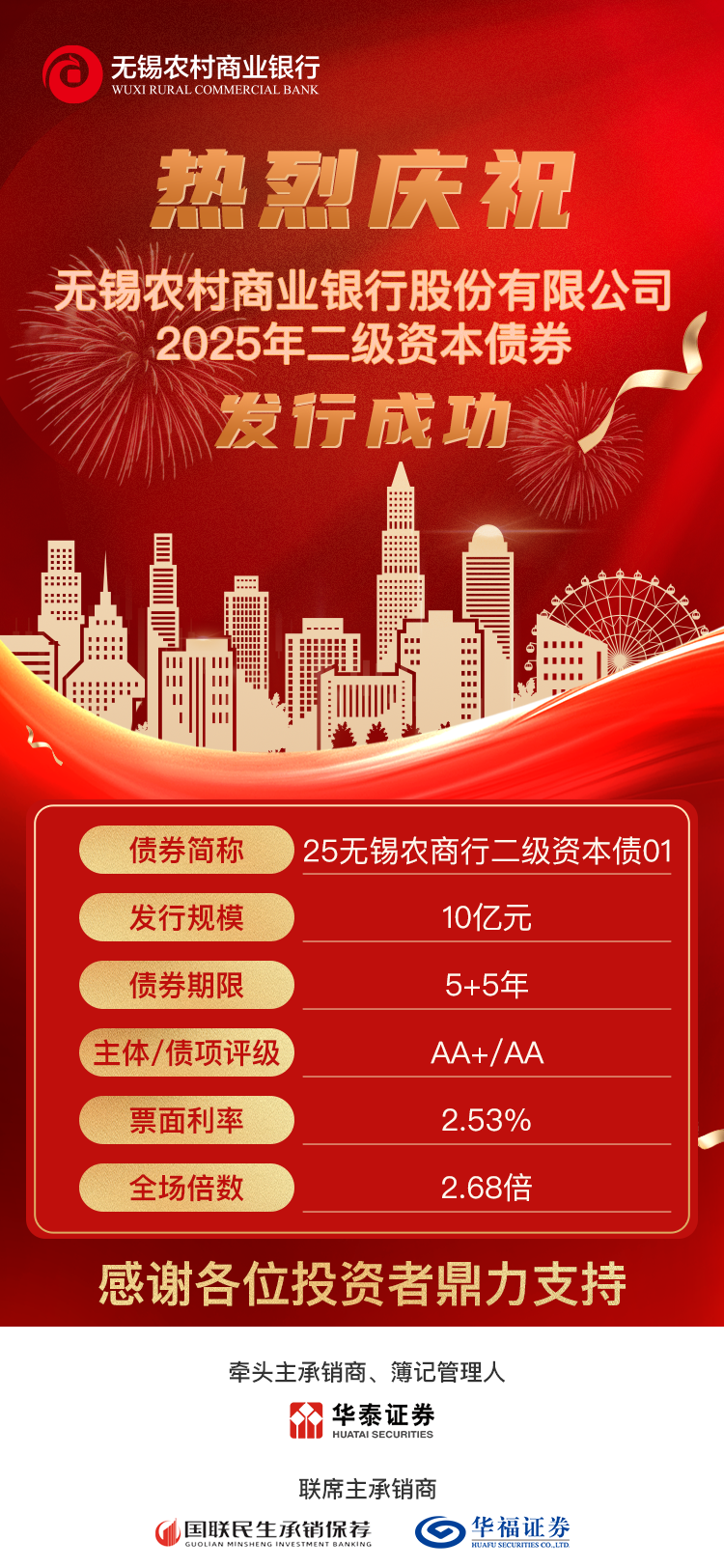 近日,无锡农村商业银行股份有限公司(以下简称“本行”或“无锡农商银行”)在全国银行间债券市场成功发行10亿元二级资本债券,发行票面利率为2.53%,低于同期AA+主体商业银行二级资本债市场平均水平,亦创本行资本补充债券发行利率新低。本次发行工作取得显著成效,市场反应积极热烈,全场认购倍数达到2.68倍,参与认购机构累计35家,充分体现了市场对本行稳健经营态势和未来发展潜力的高度认可与信心。